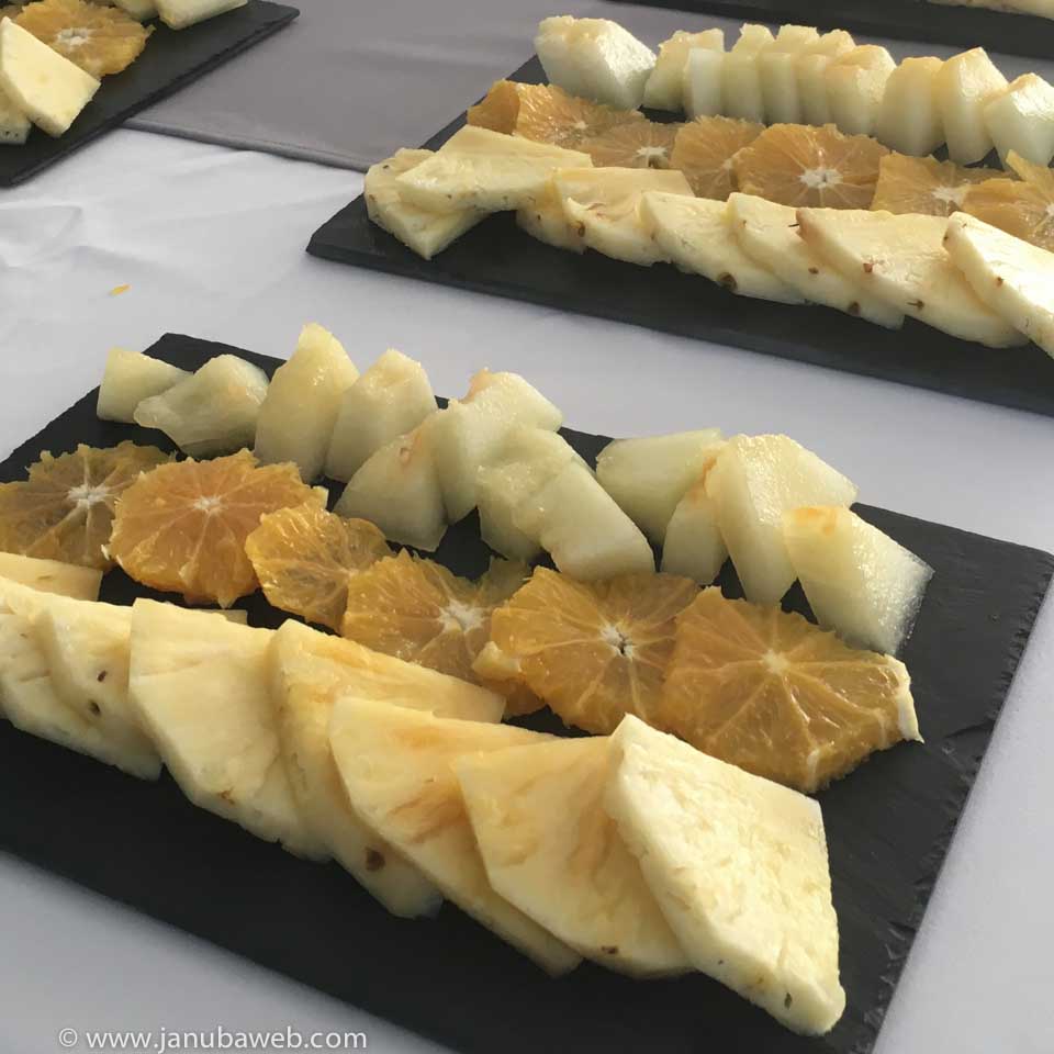Debíamos montar una mesa imperial en el centro de la sala alrededor de la cual, los invitados se fueran colocando alrededor de ella, con el fin de tener todos un fácil acceso a todos los aperitivos dispuestos. De forma paralela, habíamos colocado un para de mesas murales donde habíamos dispuesto, por un lado, la bebida y cristalería; y por otro, los postres.