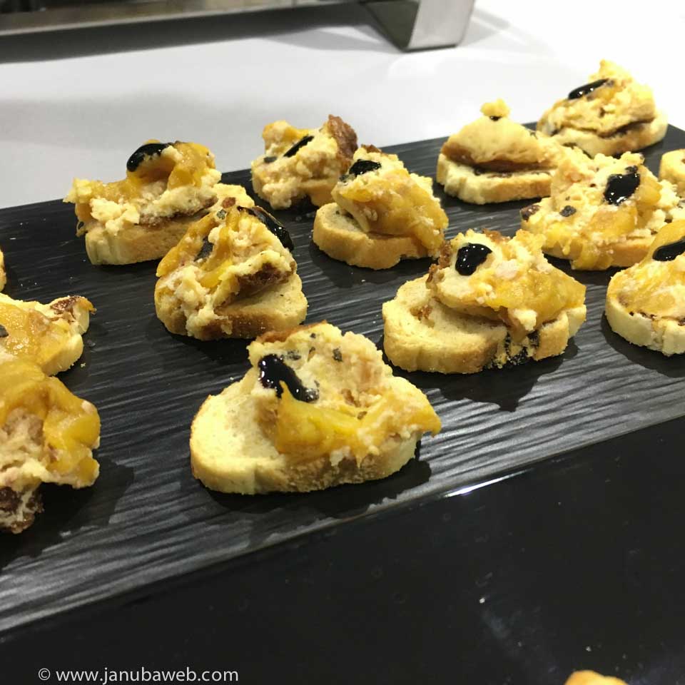 - Tosta de pudding de foie mi-cuit con chutney de mango y reducción de módena sobre pan de pasas