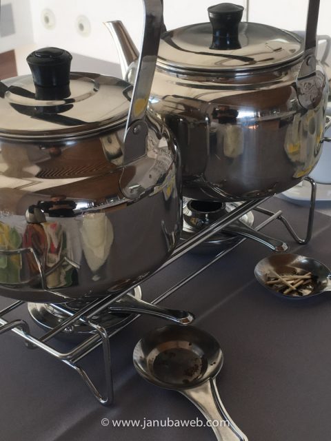 Hubo que montar dos mesas. Una de ellas, para dejar preparado todo el servicio de café e infusiones, incluyendo las paveras con el cafe recién hecho y la leche. Por otro lado, otra mesa para la comida que estaba compuesta por dulces y salados: