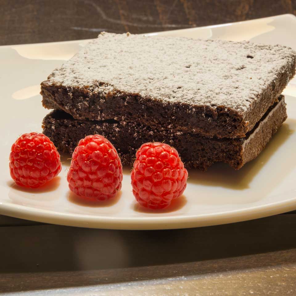 Por último, finalizamos con uno de nuestros postres más famosos y solicitados: el pastel jugoso de chocolate con avellanas y almendras.